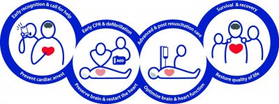 La prévention de l’arrêt cardiaque faisait déjà partie du premier cercle, mais pour souligner son importance croissante, elle a été déplacée vers l’en-tête de ce cercle. Le contenu de ce cercle a été conservé : détection précoce d’une détérioration de l’état du patient ou d’un arrêt cardiaque (à l’hôpital ou en dehors) et appel rapide aux secours. Le deuxième cercle a condensé les deux cercles centraux précédents et a intégré la réanimation cardio-pulmonaire et la défibrillation précoces comme approche intégrée pour relancer le cœur et préserver les fonctions cérébrales et cardiaques. Le nouveau dessin représente une personne utilisant un DAE pendant la réanimation cardio-pulmonaire. Le troisième cercle représente désormais les soins avancés et post-réanimation, visant à optimiser les fonctions cardiaques et cérébrales. Le dernier cercle, nouvellement conçu, souligne l’importance du rétablissement pour restaurer la qualité de vie du survivant d’un arrêt cardiaque et de sa communauté. La restauration des fonctions cardiaques et cérébrales est illustrée par un retour aux couleurs utilisées pour ces organes dans le premier cercle