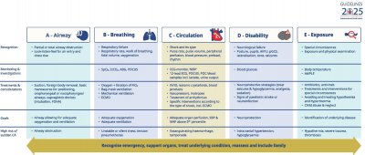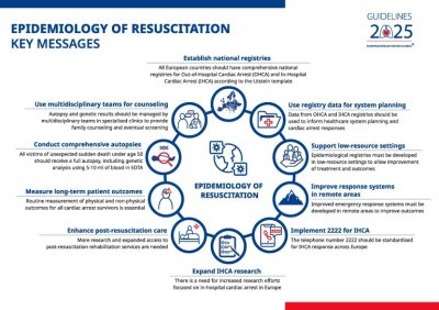 Dans certains cas, l’ERC a formulé des recommandations de bonnes pratiques en l’absence de données probantes sur certains sujets. En l’absence de revue de l’ILCOR, les groupes de rédaction de l’ERC ont mené leurs propres revues afin de formuler des recommandations. Les lignes directrices 2025 de l’ERC couvrent l’épidémiologie de l’arrêt cardiaque, le rôle des systèmes de santé dans le sauvetage de vies, les soins de réanimation de base et avancés chez l’adulte, la réanimation dans des circonstances particulières, les soins post-réanimation, la réanimation néonatale et l’accompagnement des nourrissons à la naissance, les soins de réanimation pédiatriques de base et avancés, l’éthique de la réanimation, la formation à la réanimation et les premiers secours. Ces lignes directrices constituent un cadre de recommandations pour la réanimation extrahospitalière et intrahospitalière ; leur mise en œuvre est assurée localement, en tenant compte de la législation et de la réglementation sanitaire locales.