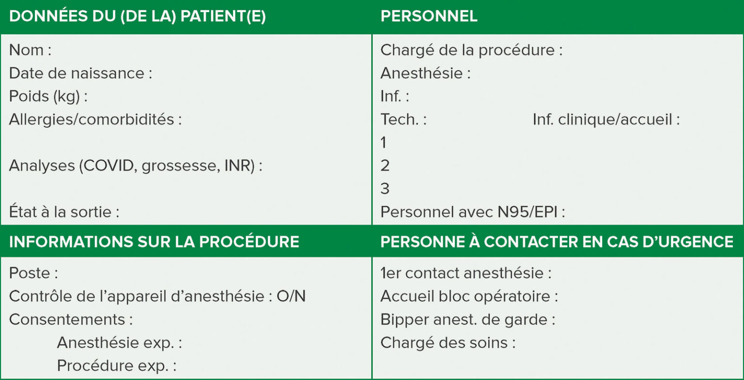 - Patient : Les données relatives au patient que contient la check-list d’une AHBO sont très semblables à celles utilisées au bloc opératoire. Il s’agit des informations habituelles sur l’identité du patient, son poids et ses allergies. Des informations complémentaires peuvent inclure les résultats d’un test de grossesse, le statut en termes de COVID-19 et les analyses de coagulation. Il conviendra également d’y présenter l’état du patient. Dans les lieux où sont pratiquées les AHBO, les personnes responsables de la procédure sont souvent des consultants, pas l’équipe des soins primaires, ce qui met l’accent sur la nécessité de clarification des plans de sortie d’hôpital, y compris le lieu des soins post-anesthésie et si le patient sera admis ou autorisé à rentrer à son domicile après la procédure.